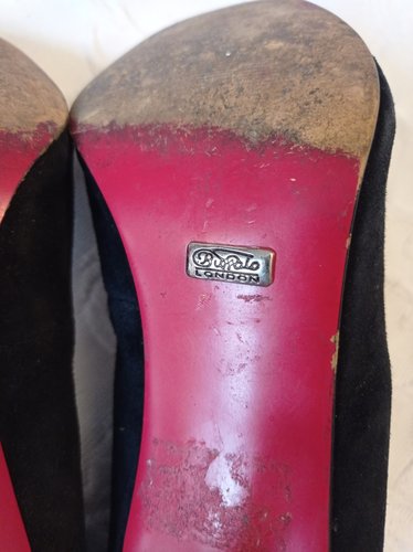 Getragene High Heels schwarz Plateau. Mit einem 9 cm hohen Pfennigabsatz.