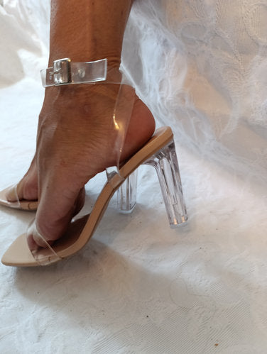 Getragene offene High Heels Damensandale Größe 39 transparent Absatz 9 cm