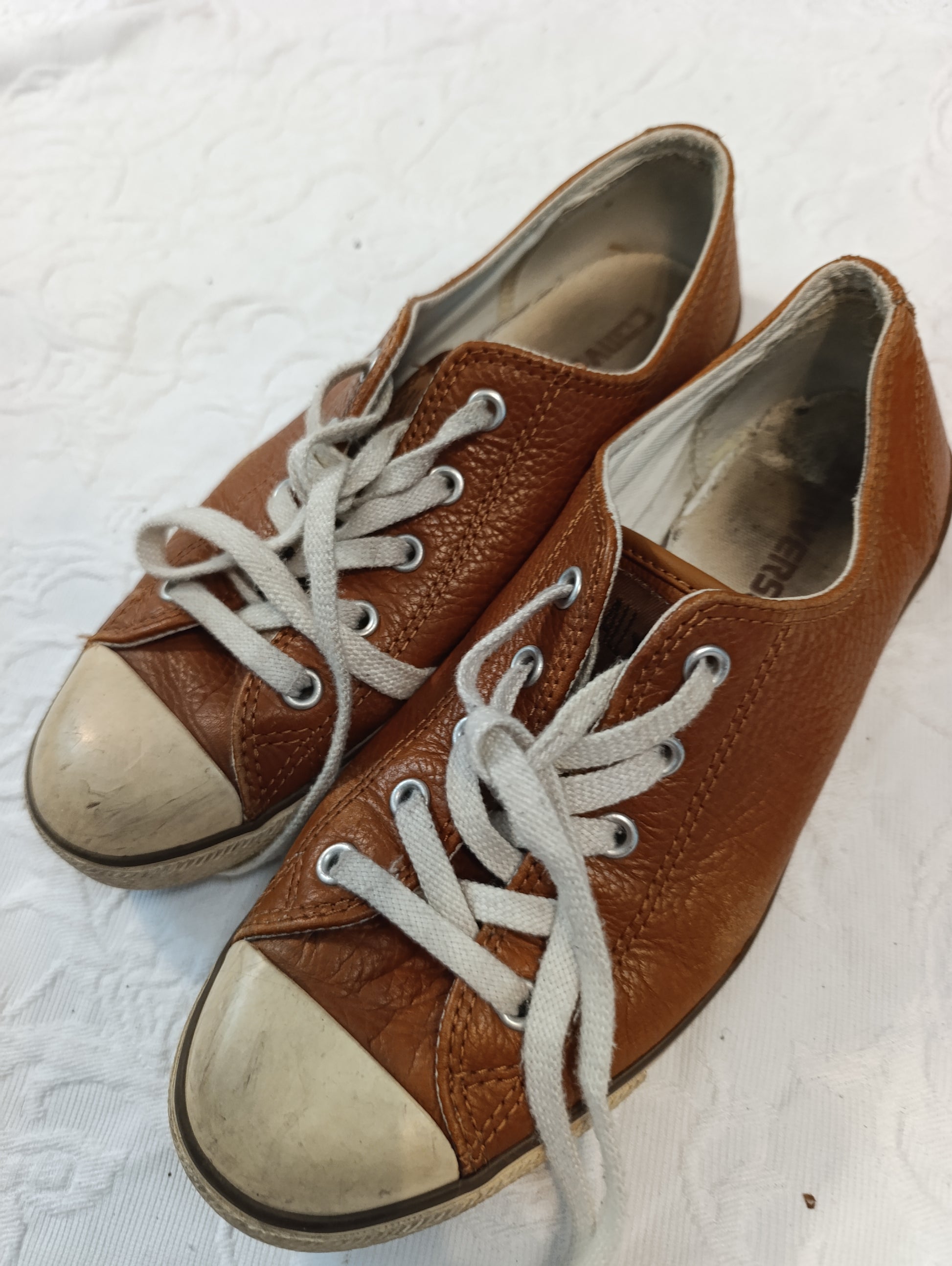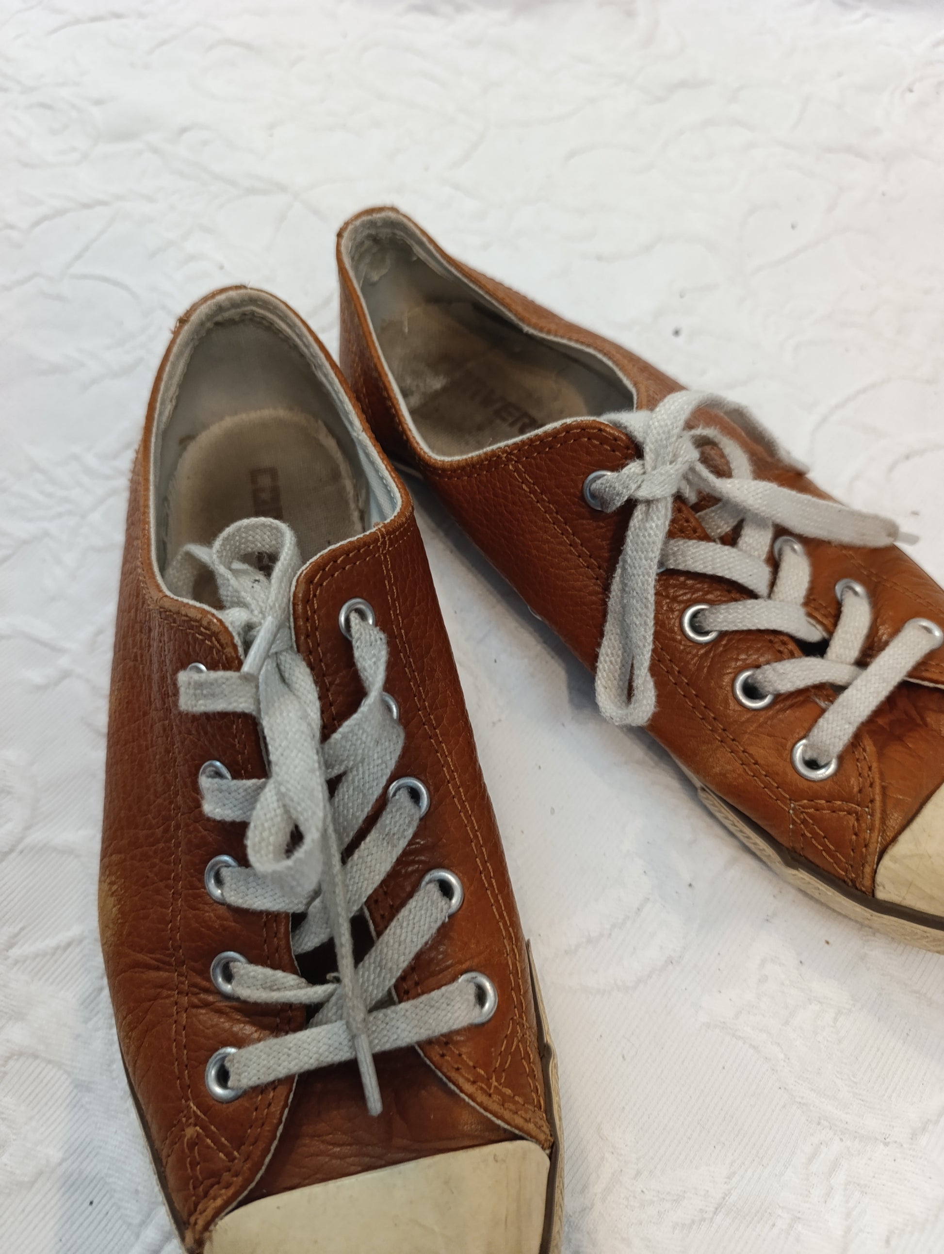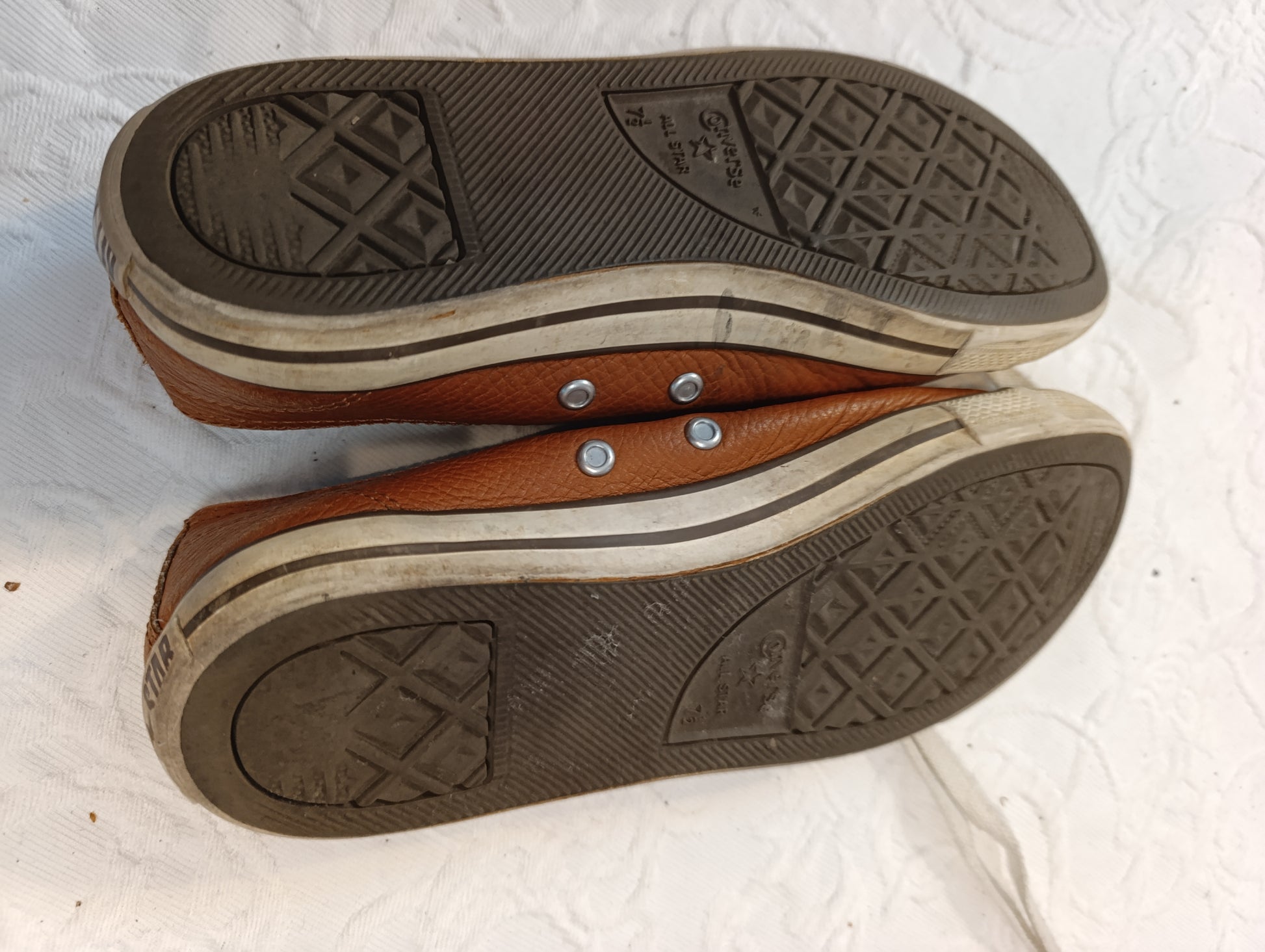 Getragene, stark abgenutzte, braune Converse, All Star Größe 38,5