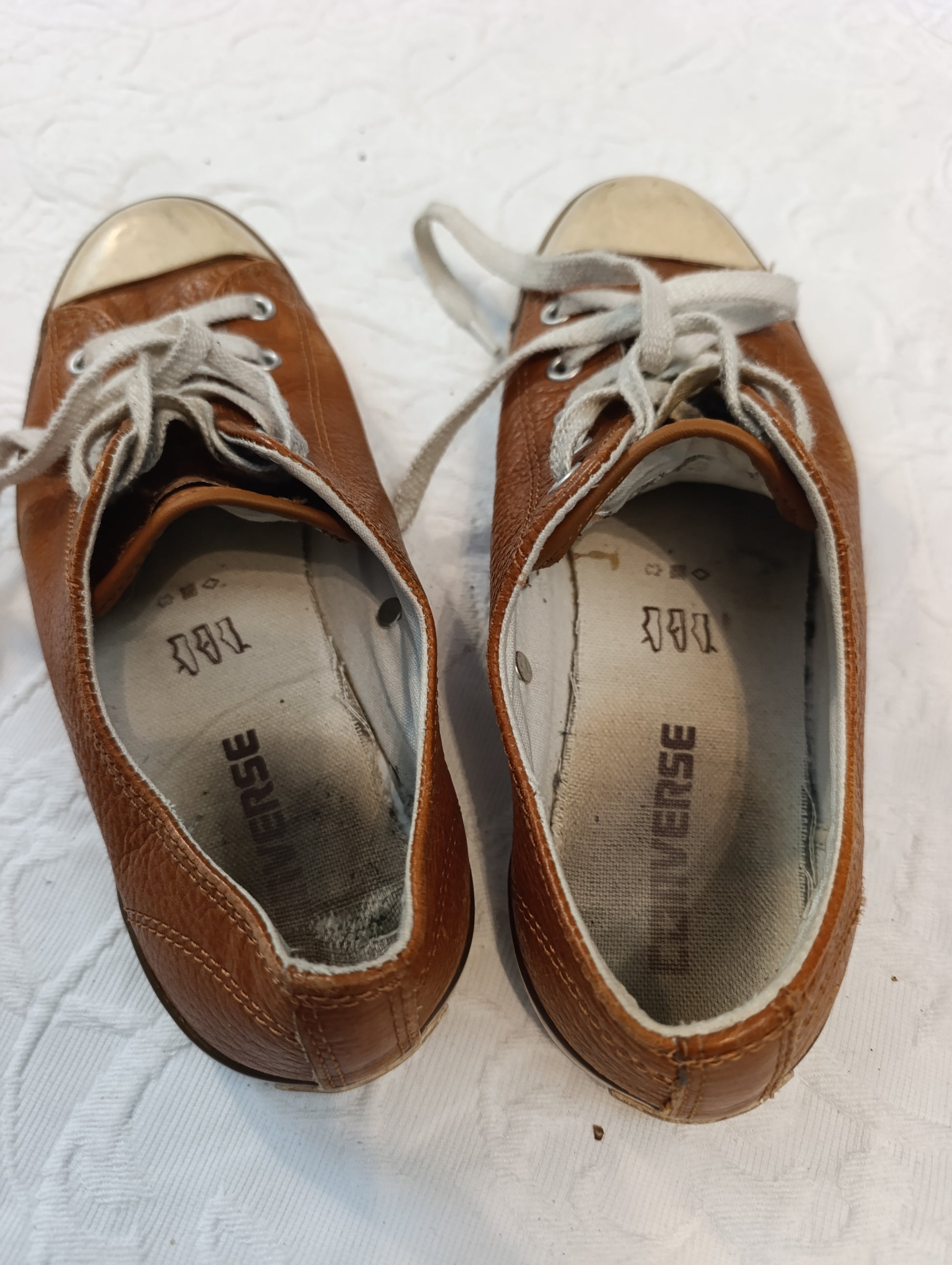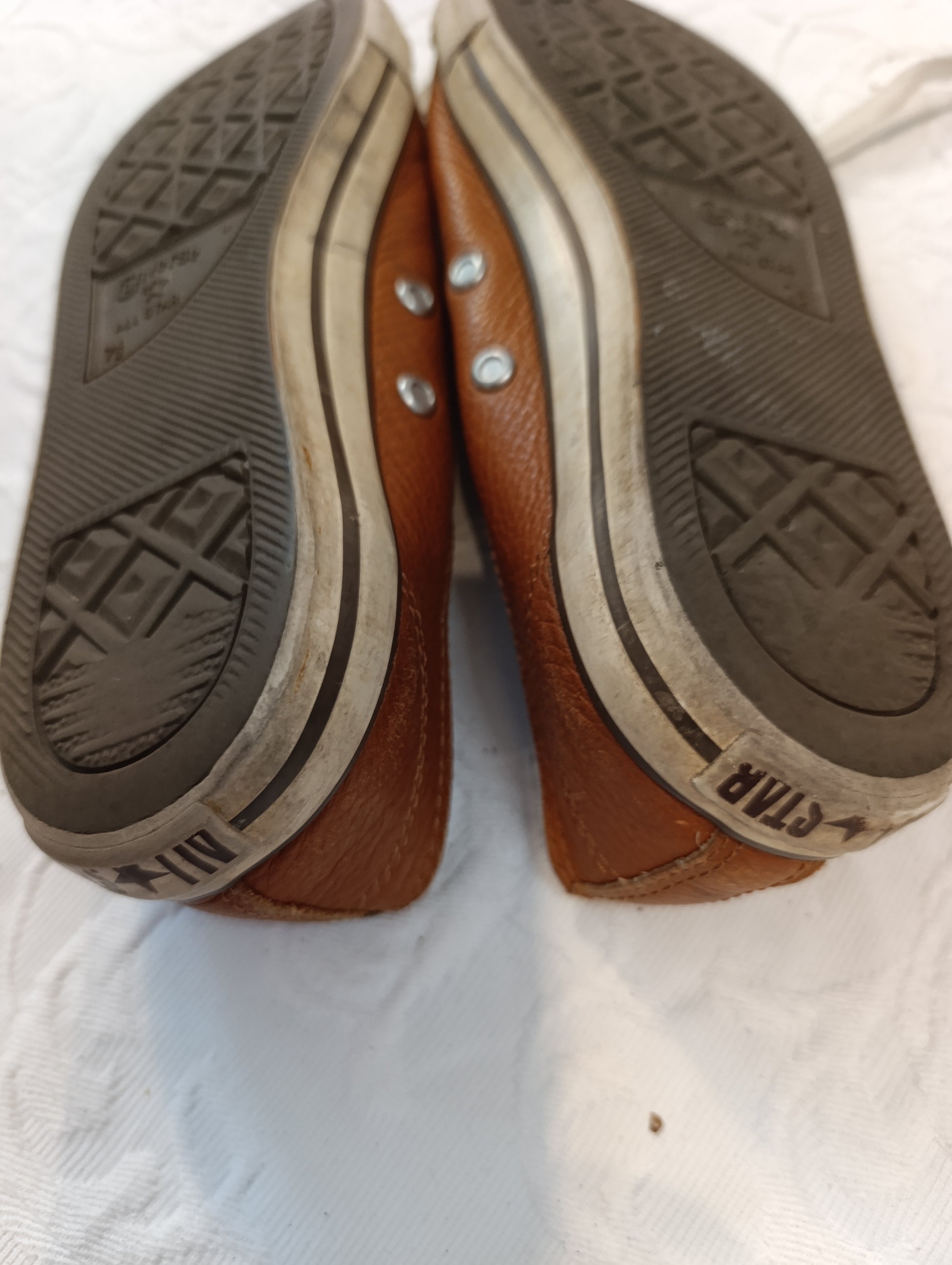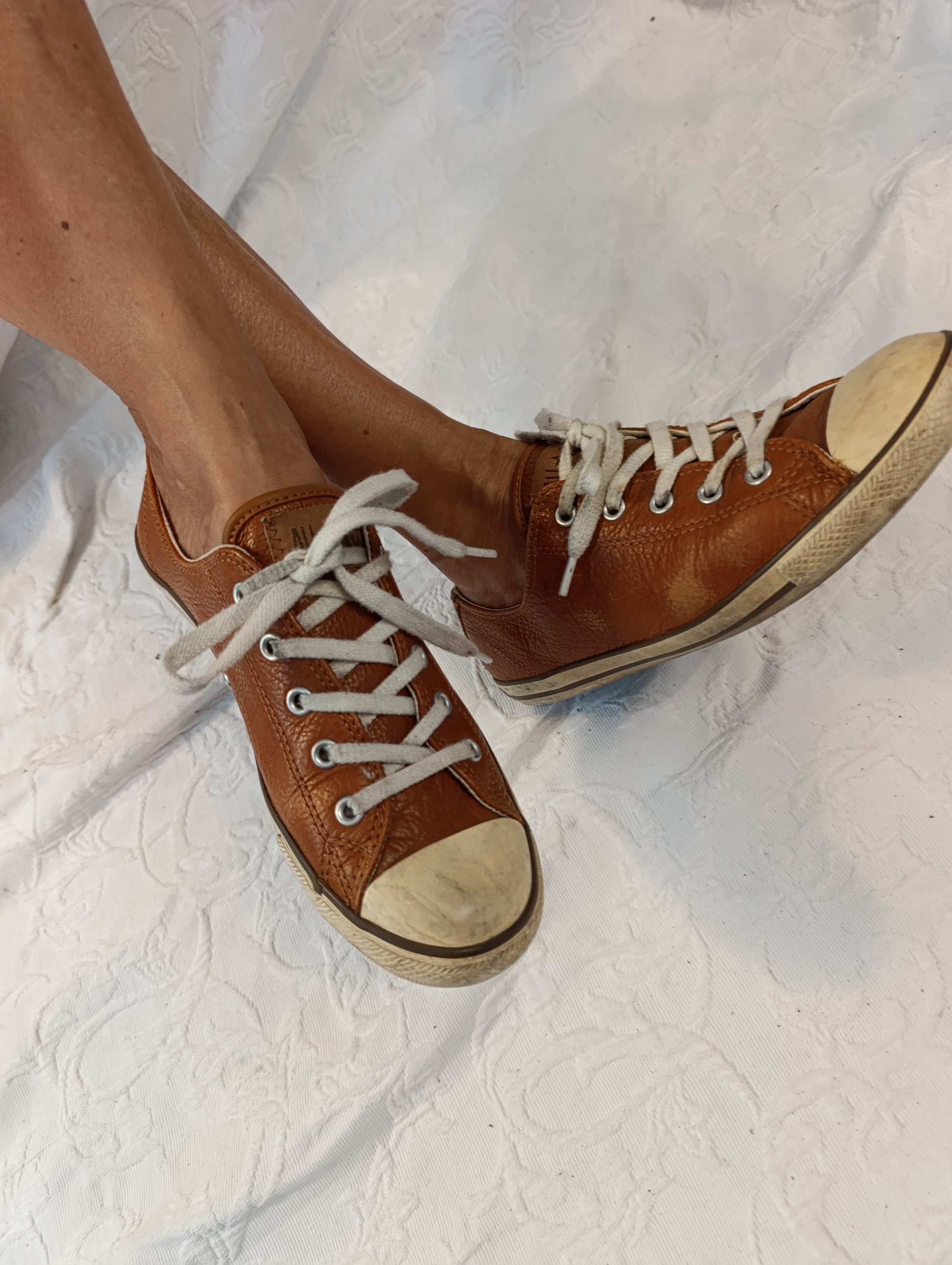 Getragene, stark abgenutzte, braune Converse, All Star Größe 38,5