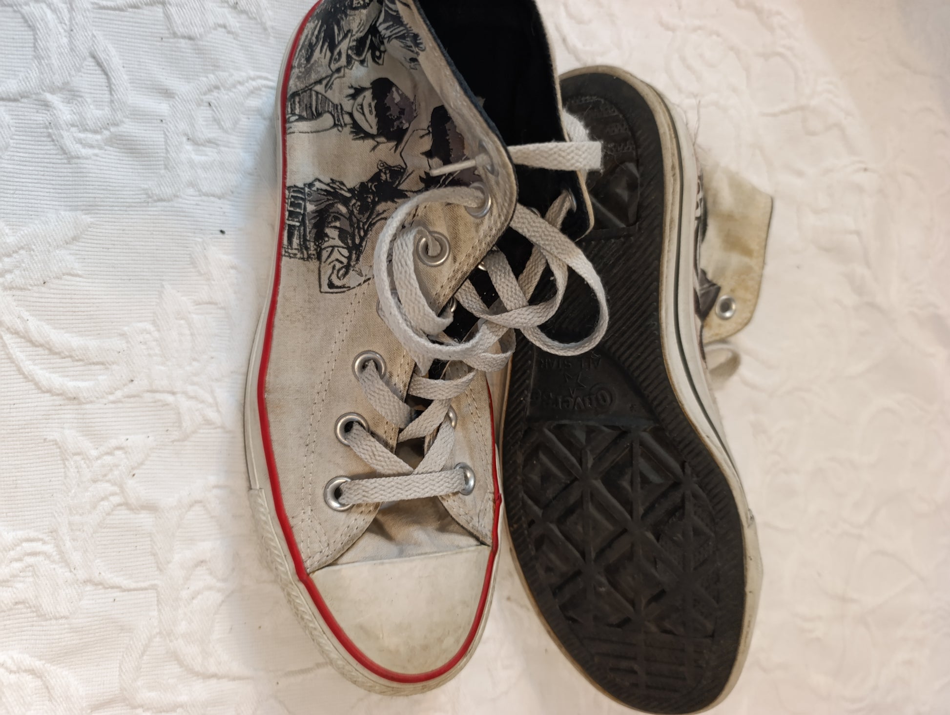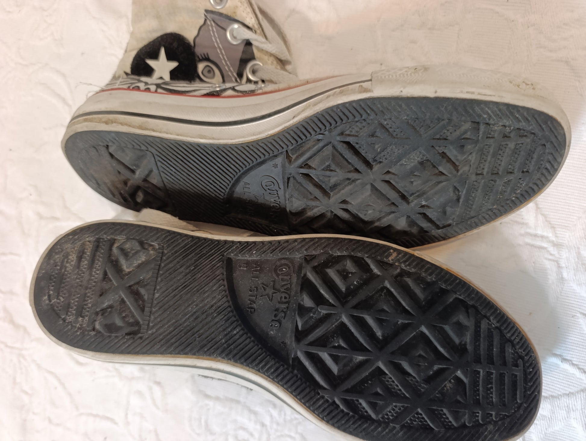 Getragene, stark abgenutzte, weiße Converse, All Star Größe 37,5