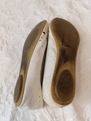 Getragene weiße Ballerinas.